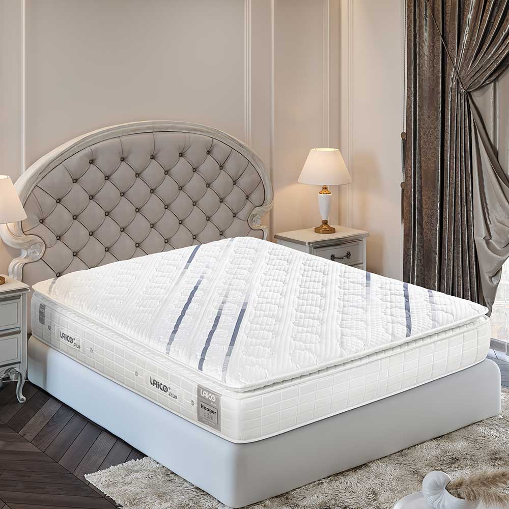 تشک فنری لایکو مدل هوگر دارای سیستم فنربندی متصل میکرو (فنرهای کم قطر، فیبروکربن با ارتفاع دو برابر بیشتر از سیستم فنربندی بونل) میباشد. همچنین دارای پد 7 سانتیمتری متشکل از اسفنج یورولوکس با قابلیت پر کردن 70 الی 80% قوس های بدن است و رویه پارچه 900 گرمی با ابر و لایی و اسپان باند پنبه دوزی شده میباشد.